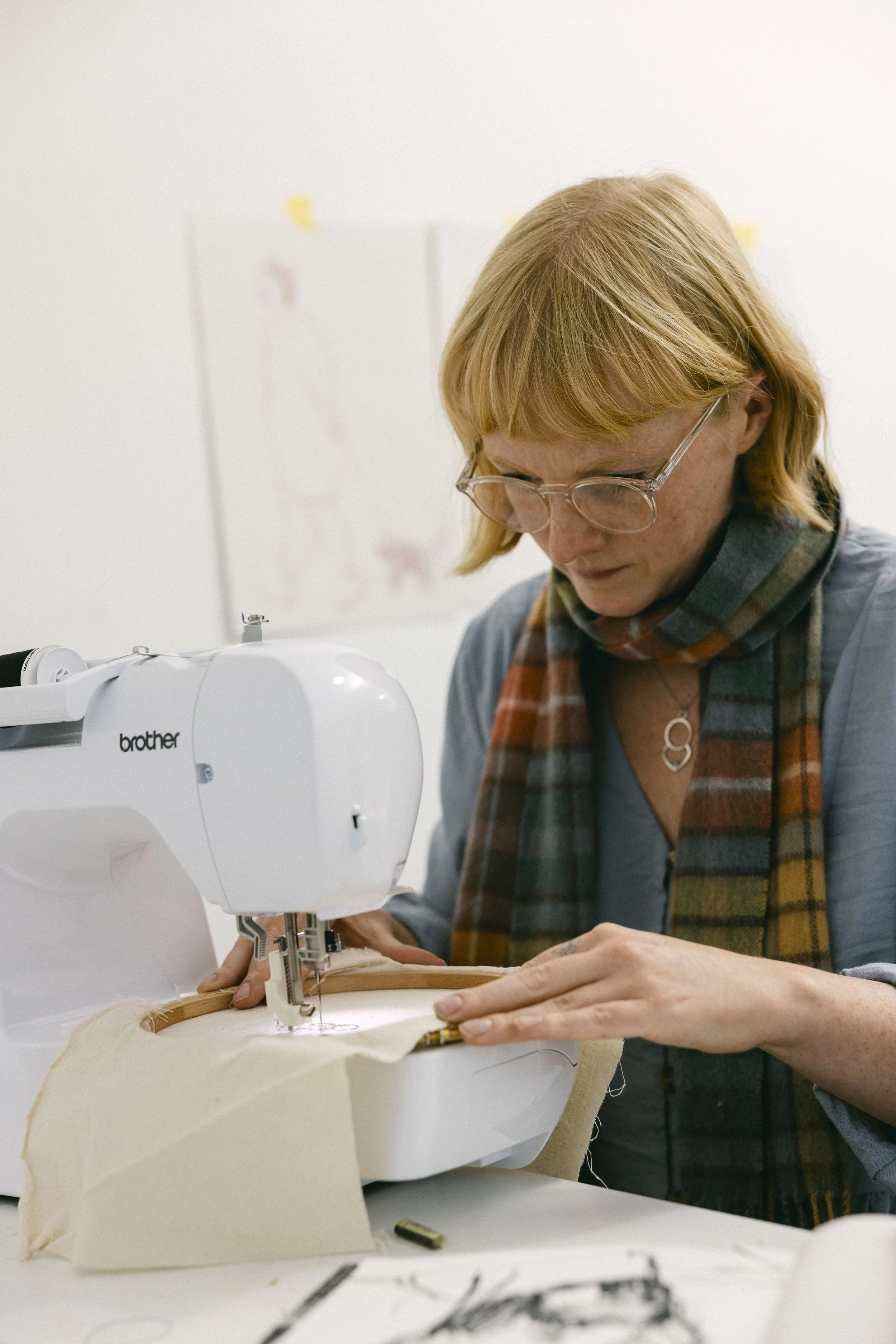Drawing from life, sketching and mark making is always the starting point for my work. I’m all about capturing people in the moment—it’s super immediate and intuitive. I give myself maybe five minutes max to get the likeness of someone. I love playing with line and experimenting with materials like machine free-motion stitching, monoprinting, and, of course, drawing.